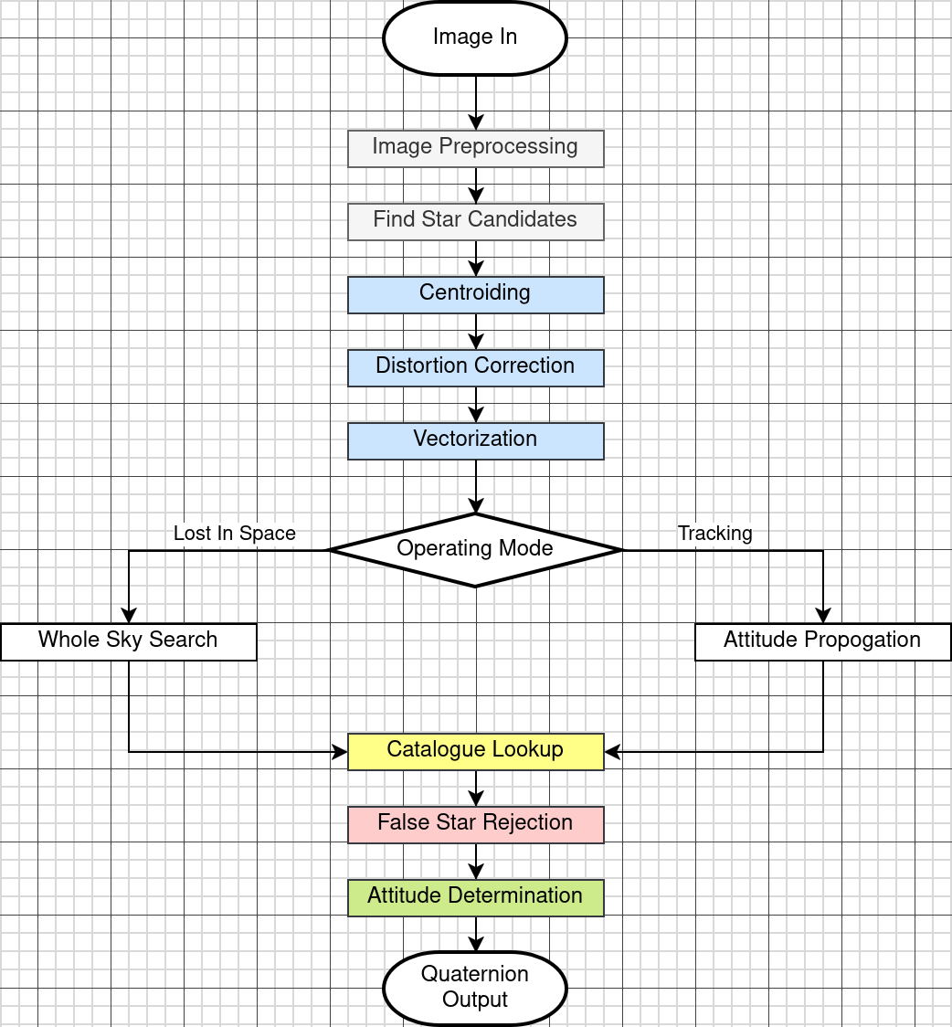 The inner workings of how a star tracker functions can be simplified to a couple high level steps that each require important design decisions to be made depending on the targets you want to meet. The way I understand a star tracker is by a deceivingly simple pipeline.