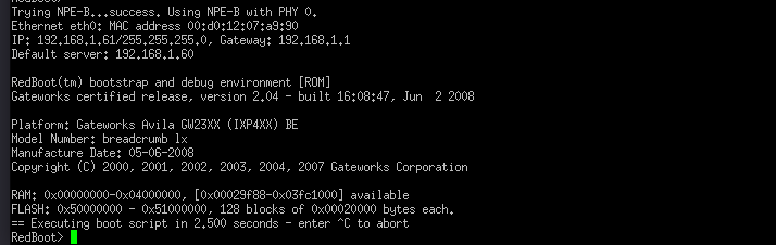 Helping to perform updates and load kernels is the RedBoot boot loader. This bootloader is a little special because it contains a super small file and simple transfer protocol implementation called the Trivial File Transfer Protocol, which is small enough to fit in a bootloader to drive updates over network interfaces. TFTP